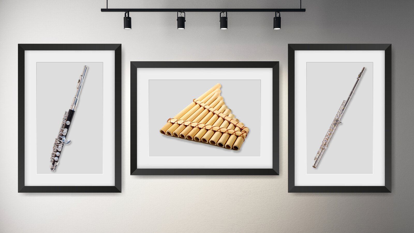 Ilustracja interaktywna przedstawia trzy instrumenty dęte drewniane prezentowane w formie obrazów wiszących na ścianie oświetlonej z góry lampą. Obrazy są w czarnych ramach. Pierwszy z lewej to flet piccolo posiadający srebrno‑czarną obudowę wykonaną z metalu. Drugim instrumentem jest fletnia pana wykonana z drewna. Trzecim instrumentem jest flet poprzeczny wykonany z metalu. Z prawej strony jest panel boczny oraz trzy teksty: Flet piccolo, Fletnia pana, Flet poprzeczny. Obok tekstów przyciski z symbolem trójkropka. Po kliknięciu na tekst, dany instrument podświetla się na grafice. Po kliknięciu na przycisk wyświetla się informacja dodatkowa. Po kliknięciu na tekst: Flet piccolo ten podświetla się na grafice, po kliknięciu na przycisk wyświetla się informacja dodatkowa o treści: instrument dęty drewniany z grupy aerofonów wargowych. Mała odmiana fletu poprzecznego, charakteryzująca się wysokim i przenikliwym dźwiękiem. Nad tekstem przykład brzmienia instrumentu, pod tekstem ilustracje przedstawiające instrument z trzech stron. Po kliknięciu na tekst: Fletnia pana ten podświetla się na grafice, po kliknięciu na przycisk wyświetla się informacja dodatkowa o treści: Instrument dęty drewniany, który składa się z szeregu drewnianych piszczałek, ułożonych w jednym lub dwóch rzędach. Dźwięki są wydobywane poprzez dmuchanie w krawędzie otworów piszczałek. Nad tekstem przykład brzmienia instrumentu, pod tekstem ilustracje przedstawiające instrument z trzech stron.Po kliknięciu na tekst: Flet poprzeczny ten wyświetla się na grafice. Po kliknięciu na przycisk wyświetla się informacja dodatkowa: instrument dęty drewniany posiadający przy jednym z końców otwór wargowy służący do zadęcia. Ma też szereg bocznych otworów wyposażonych w klapy, które służą do zmiany wysokości dźwięku. Współczesne flety poprzeczne, mimo, że należą do grupy instrumentów dętych drewnianych, wykonuje się z metalu, najczęściej ze srebra. Nad tekstem przykład brzmienia instrumentu, pod tekstem ilustracje przedstawiające instrument z trzech stron.