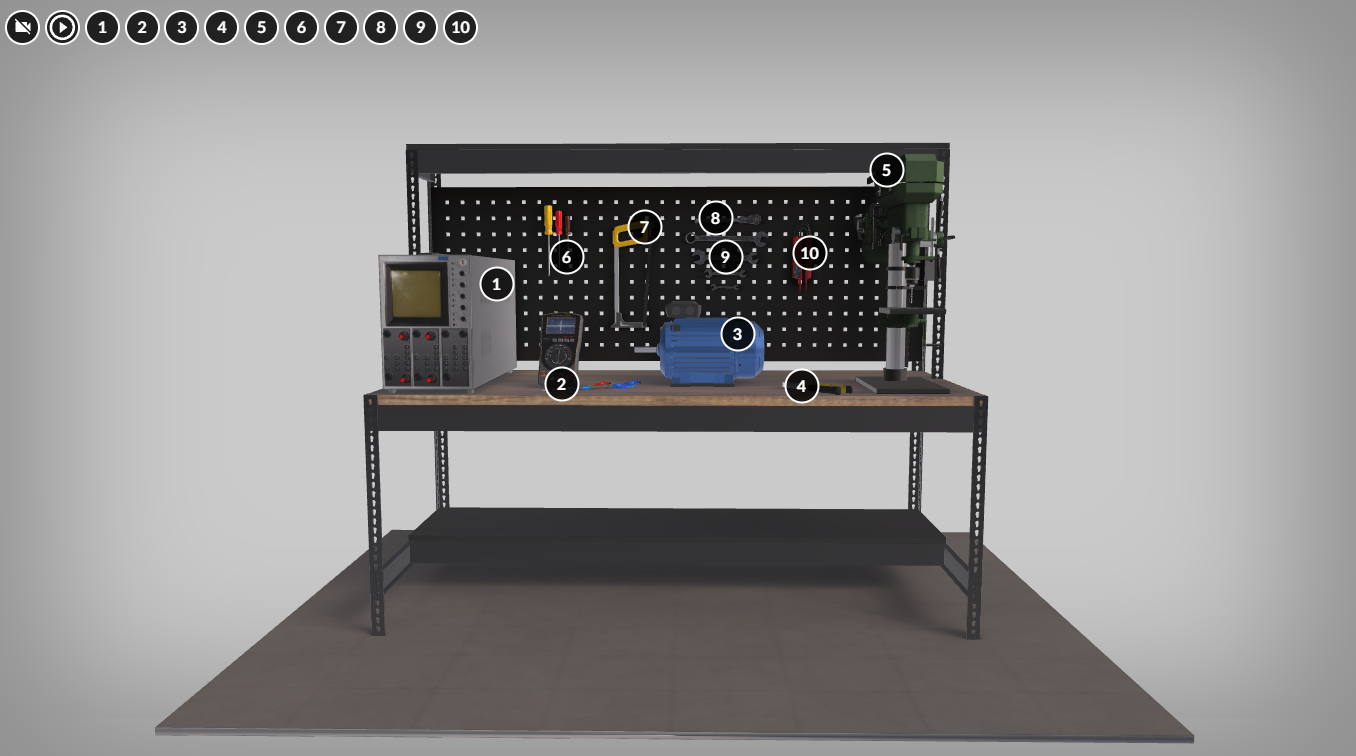 Model 3D. Przedstawia stół warsztatowy z urządzeniami i narzędziami niezbędnymi w pracy elektromechanika. Są to: oscyloskop, multimetr, silnik elektryczny, szczypce uniwersalne, wiertarka stołowa, śrubokręty, piła ręczna, klucze płaskie i nasadowe oraz woltomierz. Stół można obejrzeć z każdej strony. Na ilustracji znajdują się punkty interaktywne, po kliknięciu których pojawia się ramka z tekstem oraz z tożsamym z nim nagraniem audio.