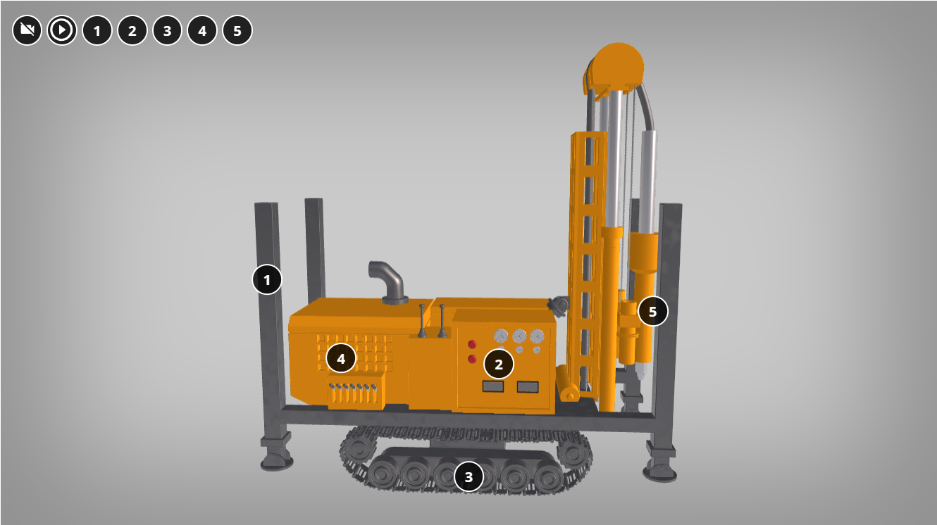 Na modelu znajdują się punkty interaktywne, po których kliknięciu pojawia się ramka z nazwą elementu i tożsamym z nim nagraniem audio. Wymienione elementy wiertnicy geotechnicznej to: