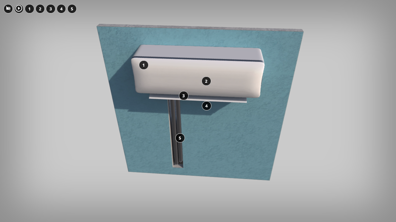 Model 3 D przedstawia klimatyzator ścienny. Jest to kwadratowa skrzynka przyczepiona do fragmentu ściany. Front klimatyzatora skonstruowany jest z okrągłej śiatki, za którą widać wiatrak. Obok wiatraka, znajduje się cylinder z metalowymi przewodami. Jest to sprężarka. Po drugiej stronie ściany, wisi prostokątna skrzynka.