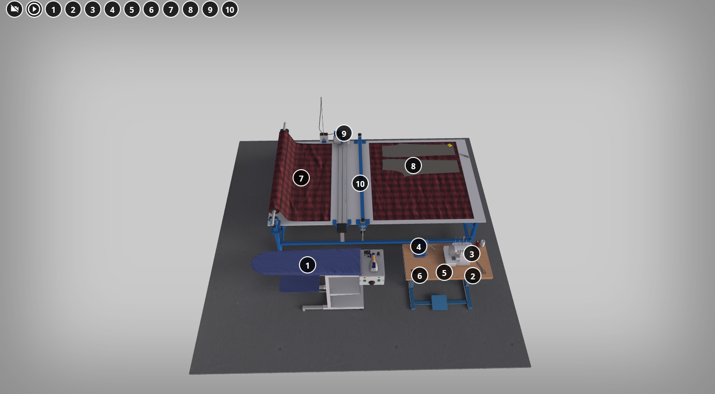 Wizualizacja trzy de przedstawia stanowisko pracy krawca. Widoczny jest stół z rozłożonym materiałem w kratkę. Na materiale leżą wycięte z kartonu wzory. W poprzek stołu, na materiał naciska listwa dociskowa. Materiał rozwiniety jest z rolki, przymocowanej do stołu. Obok widoczna jest deska prasowalnicza z żelazkiem, oraz stolik z maszyną do szycia. Na modelu umieszczone są ponumerowane punkty. Po kliknięciu na dany punkt wyświetla się nazwa sprzętu i jego opis.