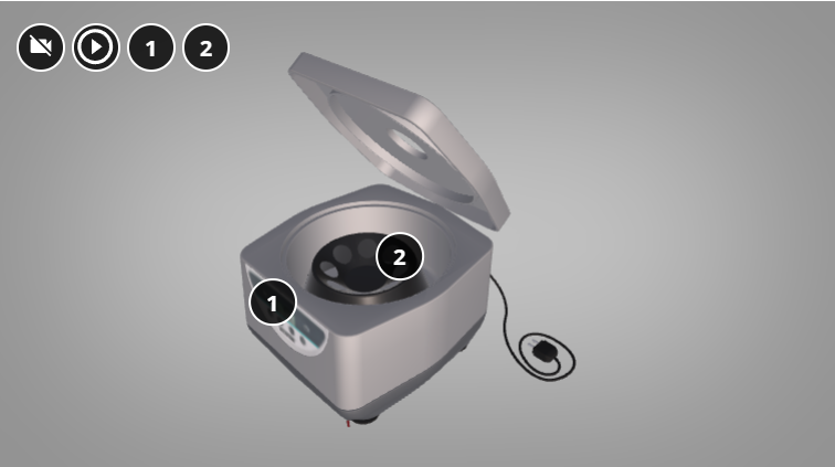 Na modelu znajdują się punkty interaktywne, po których kliknięciu pojawia się ramka z nazwą elementu i tożsamym z nim nagraniem audio. Wymienione elementy wirówki laboratoryjnej to: