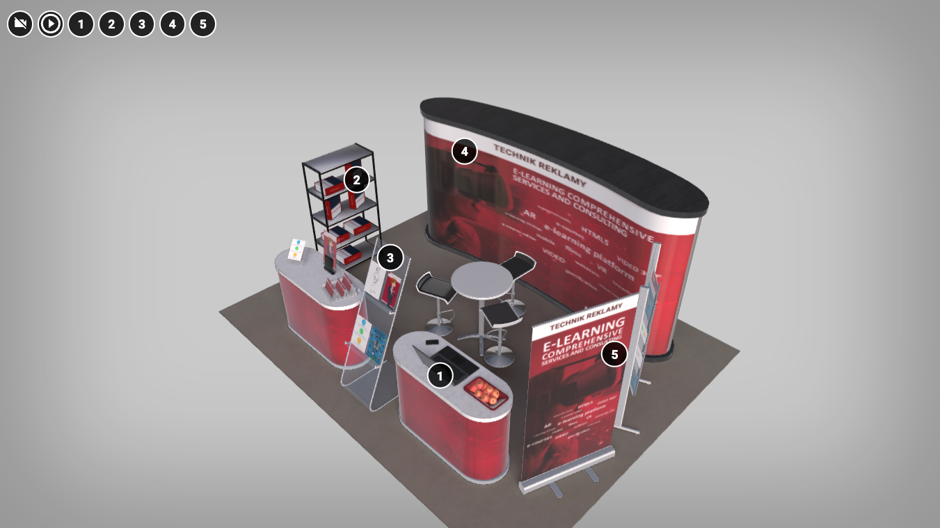 Model 3D przedstawia stanowisko pracy przy ekspozytorach reklamowych. Po kliknięciu na przycisk, pokazana jest grafika przedstawiająca ekspozytory reklamowe i wystawiennicze wraz ze stanowiskiem pracy technika reklamy.