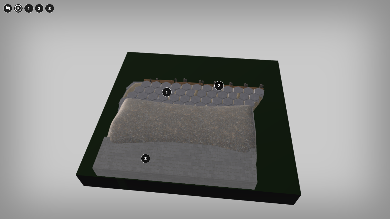 Na wizualizacji widać model materiałów stosowanych do melioracji. Przedstawiona trzy rodzaje materiałów. Pierwszy to pustobet, szare sześciokątne płytki z przodu modelu. Drugi to kiszka faszynowa, płotek faszynowy z przodu modelu. Trzeci to okładzina kamienna, symetryczne płytki kamienna z tyłu modelu.