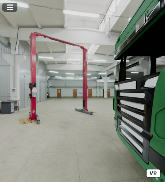 Model trzy D zatytułowany Kierowca mechanik - wykorzystywane narzędzia. Model w panoramiczny sposób przedstawia wnętrze warsztatu samochodowego. Znajdują się w nim pojazdy osobowe, ciągnik samochodu ciężarowego, szafki z narzędziami, stoły i urządzenia diagnostyczne. Przy ciągniku samochodu ciężarowego stoi walizka z kluczami oraz stolik, na którym są: CB radio z mikrofonem wielofunkcyjnym, tachograf oraz nawigacja GPS. W górnym rogu znajduje się ikona menu, po której kliknięciu wyświetla się ramka z następującym tekstem: