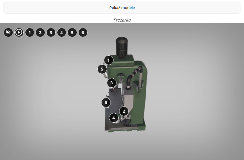 Modele trzy D pod tytułem narzędzia wykorzystywane przez technika mechanika. Do wyboru są cztery modele: frezarka, imadło, szlifierka kątowa oraz tokarka. Każdy model można obejrzeć z różnych stron. Na każdym modelu znajdują się punkty interaktywne, po których kliknięciu pojawia się ramka z tekstem oraz tożsamym z nim nagraniem audio. Frezarka.