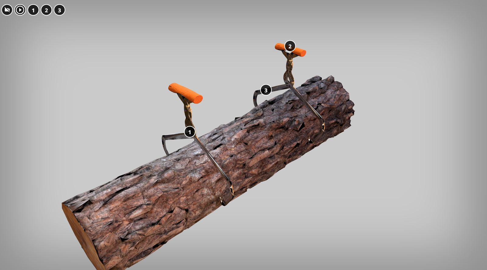Na wizualizacji widać ścięty pniak drewna. Zamontowane zostały na nim kleszcze do przenoszenia drewna. Posiadają one stalową konstrukcję oraz przypominają budową szczypce. W ich górnej części znajduje się pomarańczowa rączka.