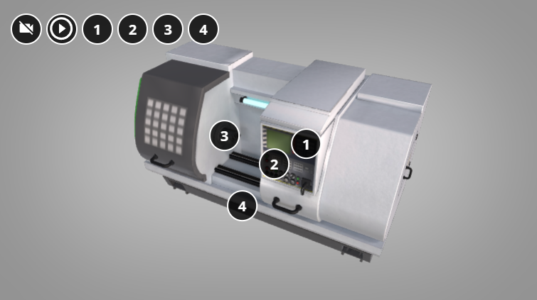Na modelu znajdują się punkty interaktywne, po których kliknięciu pojawia się ramka z nazwą elementu. W punkcie pierwszym dodatkowo obecny jest krótki opis i tożsame z nim nagranie audio. Wymienione elementy tokarki C N C to:
