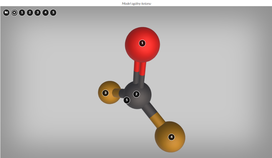 2. Grupa ketonowa. Model z zaznaczoną grupą ketonową to powielony poprzedni model, czyli model ogólny ketonu. Grupa ketonowa wyróżniona jest za pomocą jasnozielonej powłoki otaczającej atom węgla, czyli ciemnoszarą kulkę, który jest połączony wiązaniem podwójnym z atomem tlenu, czyli czerwoną kulką.