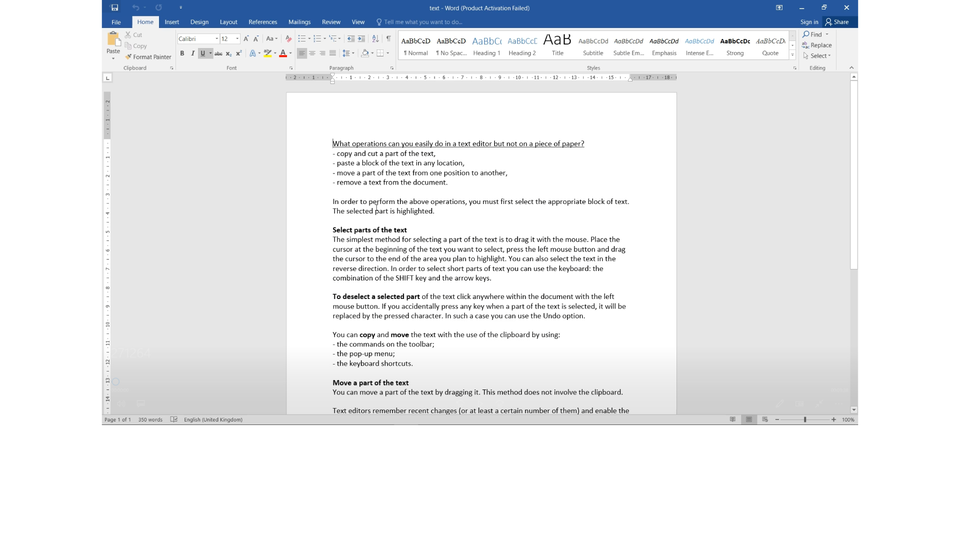 Wersja alternatywna ćwiczenia: Fill in the gaps in the text so that they match their descriptions: a 1. line of text, 2. all text, 3. single word, 4. sentence, 5. page, 6. letter, 7. line – quickly double-click the word with the left mouse button a 1. line of text, 2. all text, 3. single word, 4. sentence, 5. page, 6. letter, 7. line – click with the left mouse button on the margin near the line you want to select (only available in WordPad and Word) a 1. line of text, 2. all text, 3. single word, 4. sentence, 5. page, 6. letter, 7. line – tripple-click on the paragraph you want to select (in Writer click four times) a 1. line of text, 2. all text, 3. single word, 4. sentence, 5. page, 6. letter, 7. line – press and hold the Ctrl key and click with the left mouse button anywhere within the sentence you want to select; this method doesn’t work in WordPad (in Writer tripple-click with the left mouse button anywhere within the sentence you want to select) 1. line of text, 2. all text, 3. single word, 4. sentence, 5. page, 6. letter, 7. line – press and hold the Ctrl key and press A (Ctrl+A)