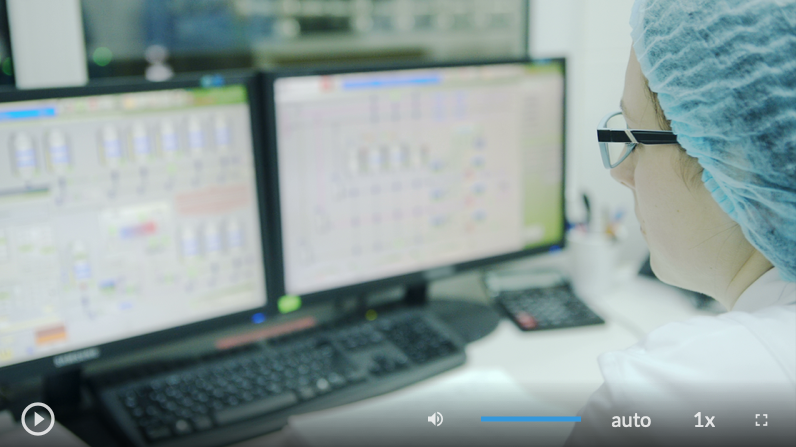 Plansza interaktywna, zatytułowana Monitoring w przemyśle chemicznym - Oprogramowanie do kontrolowania i optymalizacji procesu chemicznego. Zdjęcie przedstawia ekran komputera wraz z rozbudowanym schematem. Plansza zawiera jeden punkt interaktywny wraz z audio. 1. Oprogramowanie do kontrolowania i optymalizacji procesu chemicznego. Oprogramowanie do kontrolowania i optymalizacji procesu chemicznego jest niezwykle ważne przy produkcji kwasu siarkowego, ponieważ pomaga w monitorowaniu, sterowaniu i doskonaleniu procesu produkcyjnego.