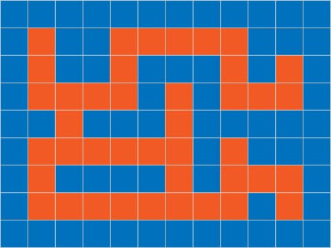 Na ilustracji pokazane jest przykładowa plansza do gry. Przedstawia ona pomarańczowy labirynt na niebieskim tle. Plansza podzielona jest na 108 takich samych kwadratów, ustawionych w dziewięciu wierszach i dwunastu kolumnach. W drugim wierszu kwadraty pomarańczowe, od lewej: 2, 5, 6, 7, 8, 9. W trzecim wierszu kwadraty pomarańczowe, od lewej: 2, 5, 9, 11. W czwartym wierszu kwadraty pomarańczowe, od lewej: 2, 3, 4, 5, 7, 9, 10, 11. W piątym wierszu kwadraty pomarańczowe, od lewej: 3, 7. W szóstym wierszu kwadraty pomarańczowe, od lewej: 2, 3, 4, 5, 6, 7, 9. W siódmym wierszu kwadraty pomarańczowe, od lewej: 2, 7, 9, 10, 11. W ósmym wierszu kwadraty pomarańczowe, od lewej: 2, 3, 4, 5, 6, 7, 8, 9, 11. Pozostałe kwadraty są niebieskie.