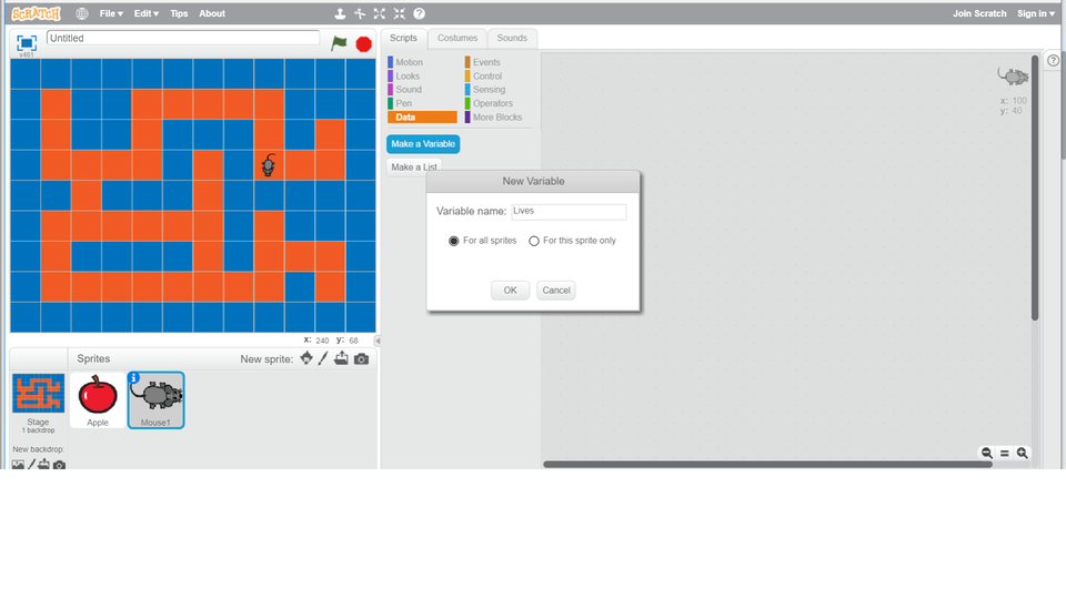In the Data category, create a new Lives variable. Look what new blocks appeared. Consider how to modify your codecodecode so that the sprite will lose one life after accidentally touching the wall of the maze. When the number of lives is exhausted, the game ends.
