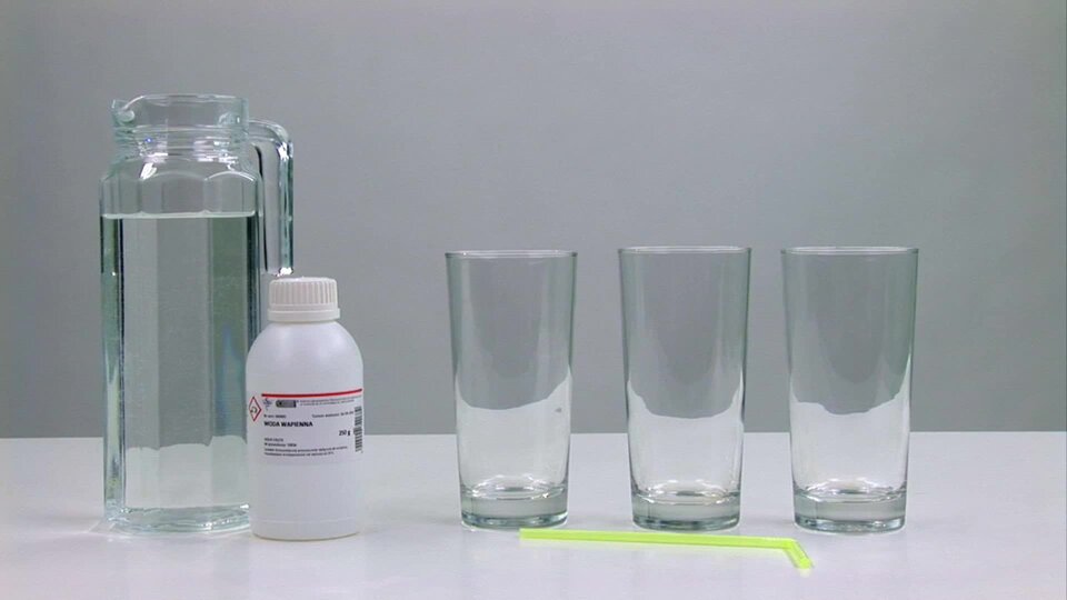 Do dwóch szklanek wlej wodę wapienną, a do trzeciej wodę z kranu.