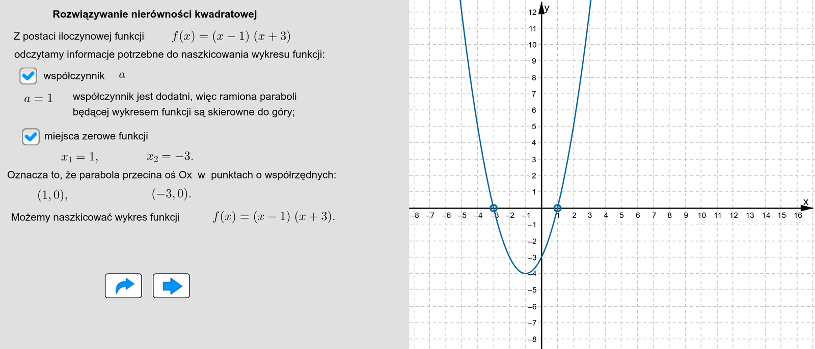 Wzór tej funkcji przekształcamy do postaci . Funkcja ma zatem dwa miejsca zerowe oraz .