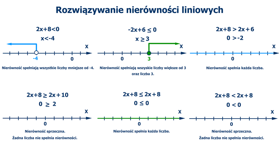 Podczas rozwiązywania nierówności postępujemy podobnie jak przy rozwiązywaniu równań. Należy jednak zwrócić uwagę na mnożenie i dzielenie obydwu stron nierówności przez liczbę ujemną.
