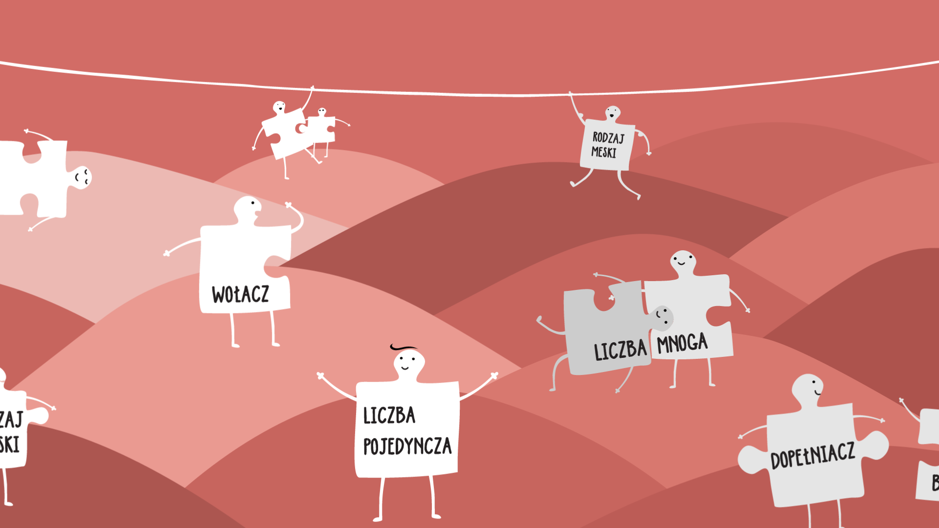 Ruchoma grafika przedstawia kawałki puzzli z rękami i nogami. Większość ma na sobie napis: wołacz, liczba pojedyncza, liczba mnoga, dopełniacz, biernik, rodzaj męski, rodzaj żeński. Są też elementy bez napisów. Dwa puzzle zawieszone są na linie, inne skaczą po pagórkach.