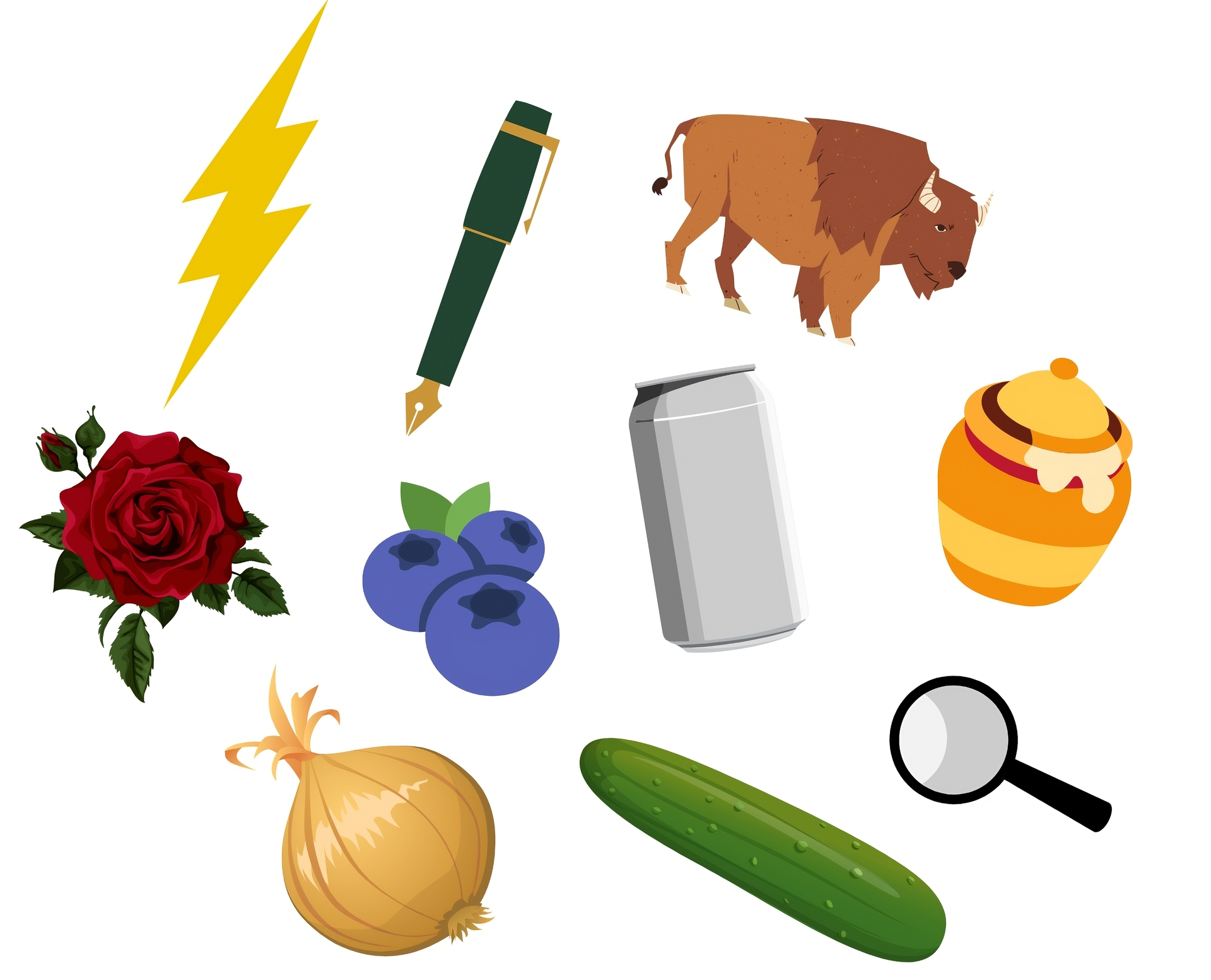 piorun, róża, pióro, borówki, cebula, ogórek, lupa, puszka, żubr, miód