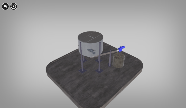 Wizualizacja 3D piaskownika. Widoczny jest obracający się model piaskownika złożony z prostokątnej platformy z zaokrąglonymi narożnikami w ciemnym kolorze, symbolizujący poziom gruntu, na której pośrodku ustawiony jest cylindryczny element zakończony stożkowato w dolnej części, ustawiony na czterech pionowych nogach. Pośrodku cylindra, po przeciwległych stronach, widoczne są dwie krótkie poziome rury zakończone pierścieniami. Po lewej stronie, na poziomie gruntu, widoczny jest cylindryczny zbiornik, nad którym znajduje się ramię, oparte na pionowych słupku, które dochodzi do stożkowatego zakończenia piaskownika. Na drugim końcu widoczne jest niebieskie zamknięcie z walcowatym elementem.