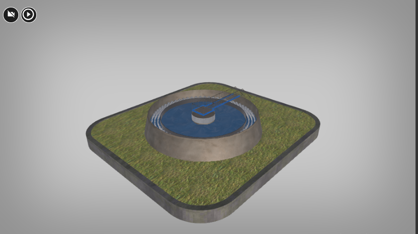 Wizualizacja 3D osadnika wtórnego. Widoczny jest obracający się model osadnika wtórnego złożony z prostokątnej platformy z zaokrąglonymi narożnikami w kolorze zielonym, symbolizujący grunt porośnięty trawą, na której pośrodku ustawiony jest cylindryczny element z zagłębieniem. W zagłębieniu widoczne jest niebieskie koło, otoczone trzema srebrnymi ząbkowanymi okręgami. Pośrodku koła znajduje się mniejszy cylinder z kwadratową platforma pośrodku, do której prowadzi ażurowa rampa z balustradą. W miejscu zakończenia balustrady widoczne są schodki prowadzące na poziom gruntu.