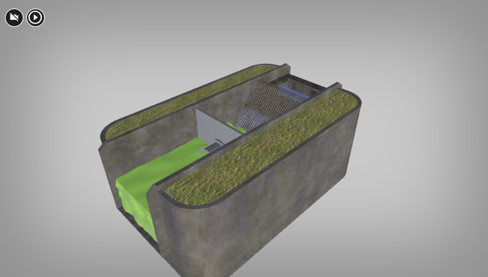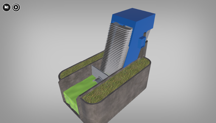 Wizualizacja 3D kraty mechanicznej. Widoczny jest obracający się model kraty mechanicznej złożony z prostopadłościanu z zaokrąglonymi narożnikami, pośrodku którego, w przekroju, widoczne jest zagłębienie. Górna część prostopadłościanu, po prawej i lewej stronie zagłębienia, jest w kolorze zielonym symbolizującym grunt porośnięty trawą. W zagłębieniu widoczna jest pionowa ścianą z fragmentem przechodzącej przez nią rury. W tylnej części widoczny jest rząd poziomych krat poprowadzonych pod lekkim skosem, ponad poziom gruntu, oddzielających zbiornik wypełniony niebieskim kolorem.