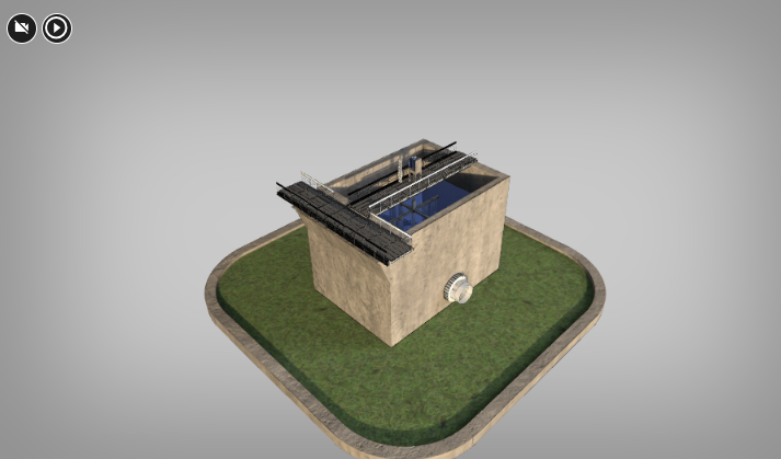 Wizualizacja 3D komór flokulacji. Widoczny jest obracający się model komór flokulacji złożony z prostokątnej platformy z zaokrąglonymi narożnikami w kolorze zielonym, symbolizujący grunt porośnięty trawą, na której pośrodku ustawiony jest wysoki, prostopadłościenny zbiornik w kolorze brązowym, wypełniony w środku niebieskim płynem. Na jego górze widoczne są dwie platformy z poręczami: jedna biegnąca przez środek na dłuższym odcinku, a druga biegnąca wzdłuż krótszego boku. Poniżej platformy znajdującej się pośrodku, wewnątrz zbiornika, widoczna jest krzyżowa zawieszona konstrukcja. Pośrodku znajduje się pionowy słup okrągły w przekroju. Z każdego ramienia konstrukcji prowadzą po dwa pionowe elementy, prostokątne w przekroju. Na dnie zbiornika widoczne są przeciwlegle ustawione dwa cylindry, dotykające z jednej strony ściany zbiornika.