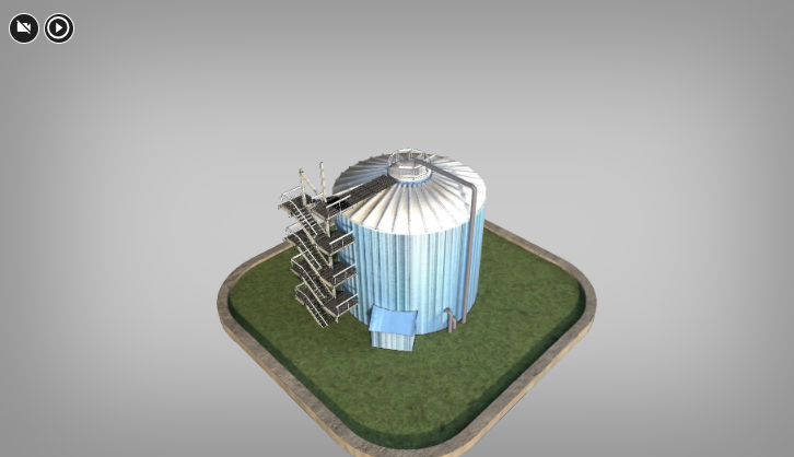 Wizualizacja 3D komór fermentacyjnych. Widoczny jest obracający się model komór fermentacyjnych złożony z kwadratowej platformy z zaokrąglonymi narożnikami w kolorze zielonym, symbolizujący grunt porośnięty trawą, na której pośrodku ustawiony jest wysoki, cylindryczny zbiornik w kolorze niebieskim zakończony w górnej części stożkowatym zamknięciem, pośrodku którego znajduje się mała okrągła platforma z poręczami. Z niej w dół, do poziomu gruntu, biegnie rura. Po jednej stronie cylindrycznego zbiornika widoczny jest dostawiony budynek ze spadzistym dachem. Od poziomu gruntu do platformy na górze prowadzą schody z poręczami, a z nich pozioma platforma.