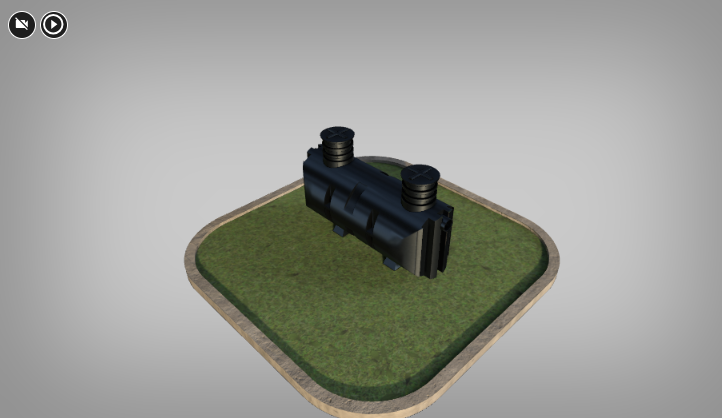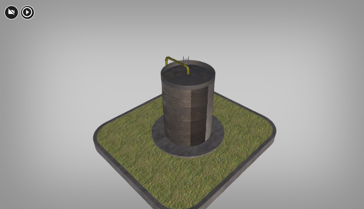 Wizualizacja 3D zbiornika wodnego. Widoczny jest obracający się model zbiornika wodnego złożony z prostokątnej platformy z zaokrąglonymi narożnikami w kolorze zielonym, symbolizujący grunt porośnięty trawą, na której pośrodku, na okrągłej szarej podstawie, ustawiony jest wysoki, cylindryczny zbiornik w kolorze ciemnoszarym, zakończony w górnej części płaski, lekko obniżonym dachem. Z niego w dół, do poziomu gruntu, biegnie rura. Po jednej stronie cylindrycznego zbiornika widoczna jest drabina prowadząca od poziomu gruntu na dach zbiornika.