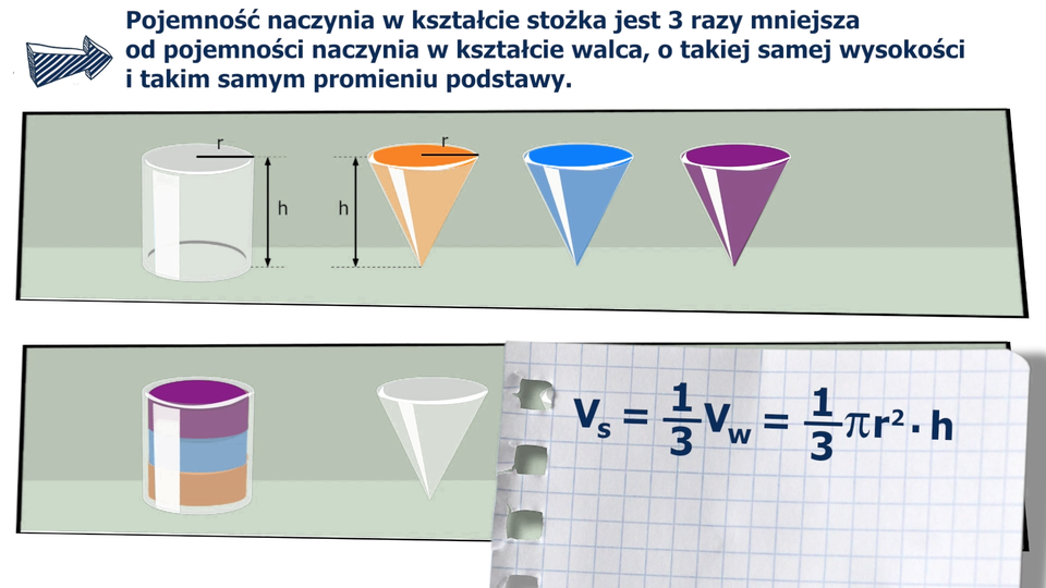 Zaobserwuj, jak zmienia się stosunek objętości walca do objętości stożka wraz ze zmianą wysokości brył.