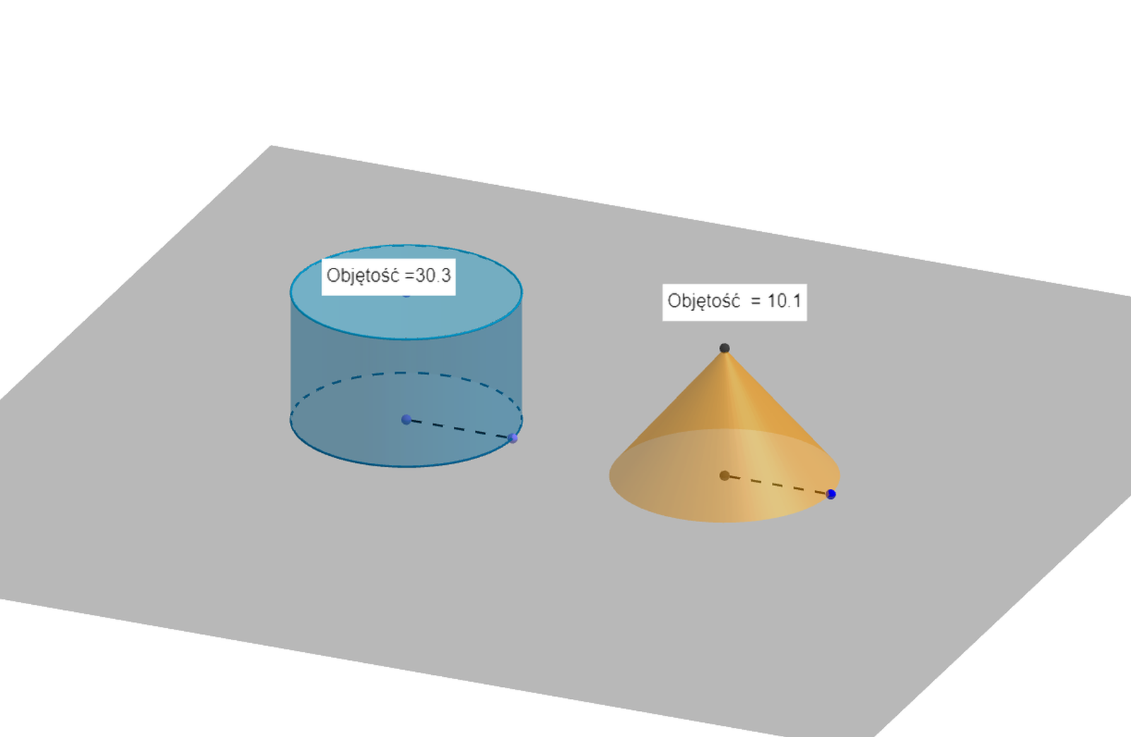 Walec i stożek mają taki sam promień podstawy i taką samą wysokość . Zaobserwuj, jak zmienia się stosunek objętości walca do objętości stożka wraz ze zmianą wysokości brył.