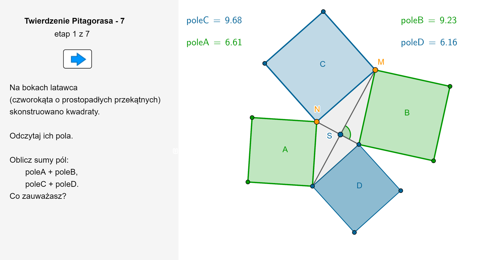 Zmieniaj położenie punktu , również tak, aby uzyskać trójkąt prostokątny. W każdym przypadku porównuj sumy pól kwadratów leżących naprzeciw siebie. Co zauważasz?