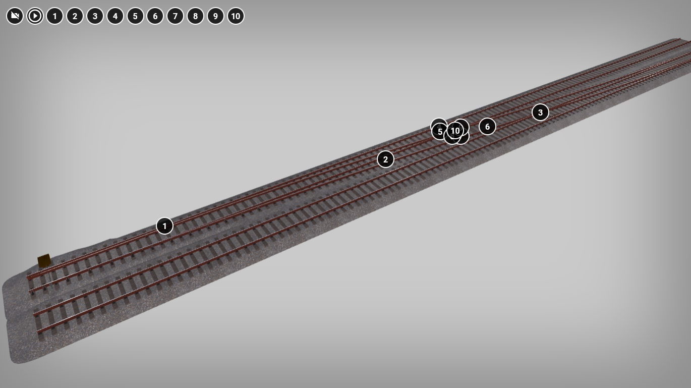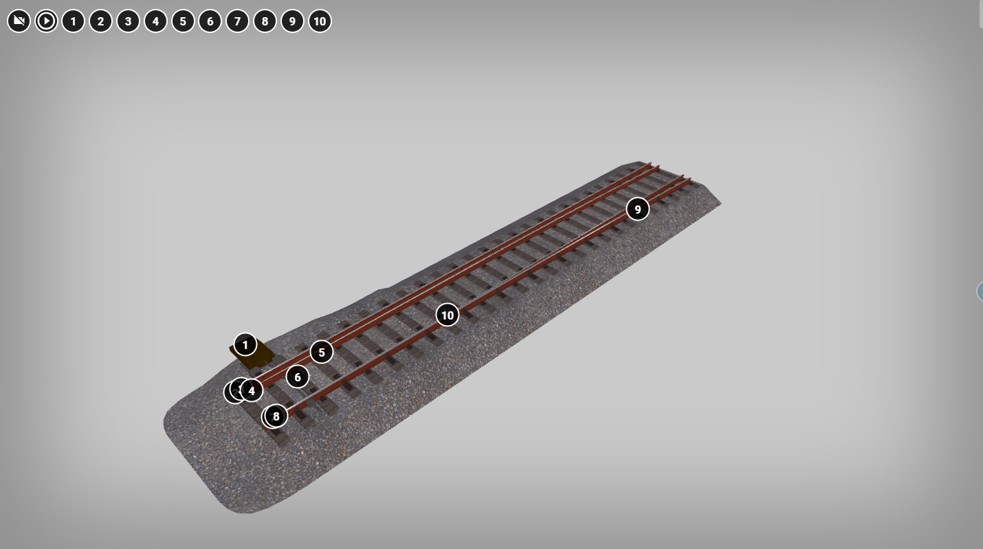 Model przedstawia głowicę stacji, czyli drogę zwrotnicową, która jest usytuowana na końcu stacji lub grupy torów. Jest to fragment torowiska, na którym znajdują się dwa tory. Budowa torowiska jest następująca: najniżej znajduje się podsypka z kamienia, na niej ułożone są podkłady kolejowe, do których przymocowane są szyny. Obydwa tory, na ukazanym fragmencie, wyposażone są w zwrotnice umożliwiające przekierowywanie pojazdów z jednego toru na drugi. Na modelu znajduje się dziesięć punktów interaktywnych wskazujących na elementy składowe głowicy stacji: zwrotnica, szyny łączące, krzyżownica, kierownica, tor zasadniczy, tor zwrotny, kierownica, krzyżownica (zespół elementów rozjazdu), dziób krzyżownicy, szyna skrzydełkowana.
