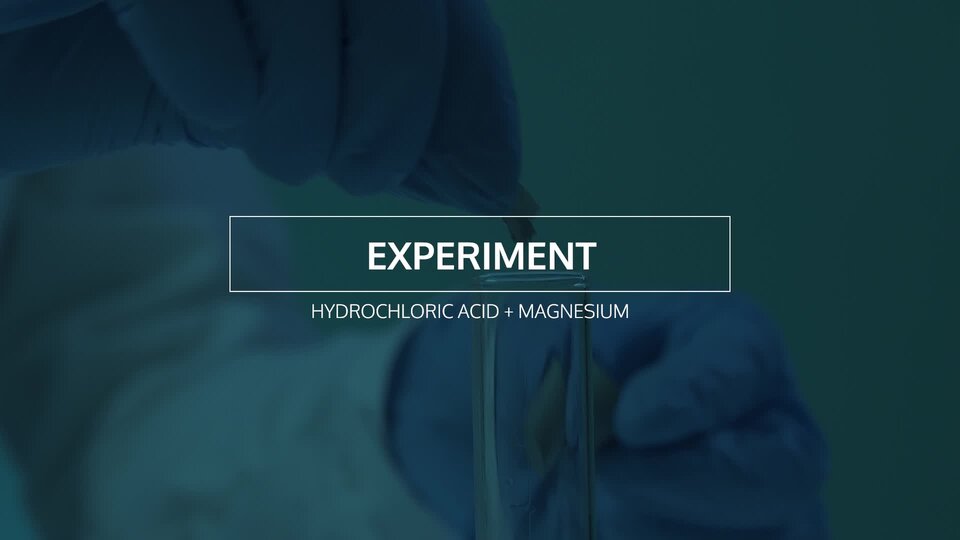 Film pokazuje eksperyment – reakcję kwasu chlorowodorowego, hydrochloric acid oraz magnezu, magnesium. Będziesz potrzebować: kwas chlorowodorowy, wstążkę magnezową, zapalniczkę, pipetę, łuczywo, korek. Do probówki dodajemy pipetą kilka kropli kwasu chlorowodorowego i kawałek wstążki magnezowej. Zachodzi burzliwa reakcja, wydziela się gaz. Zatykamy lekko probówkę korkiem. Zapalamy łuczywo. Otwieramy korek i przykładamy zapalone łuczywo do wylotu probówki – wydobywający się z probówki gaz spala się wybuchowo.