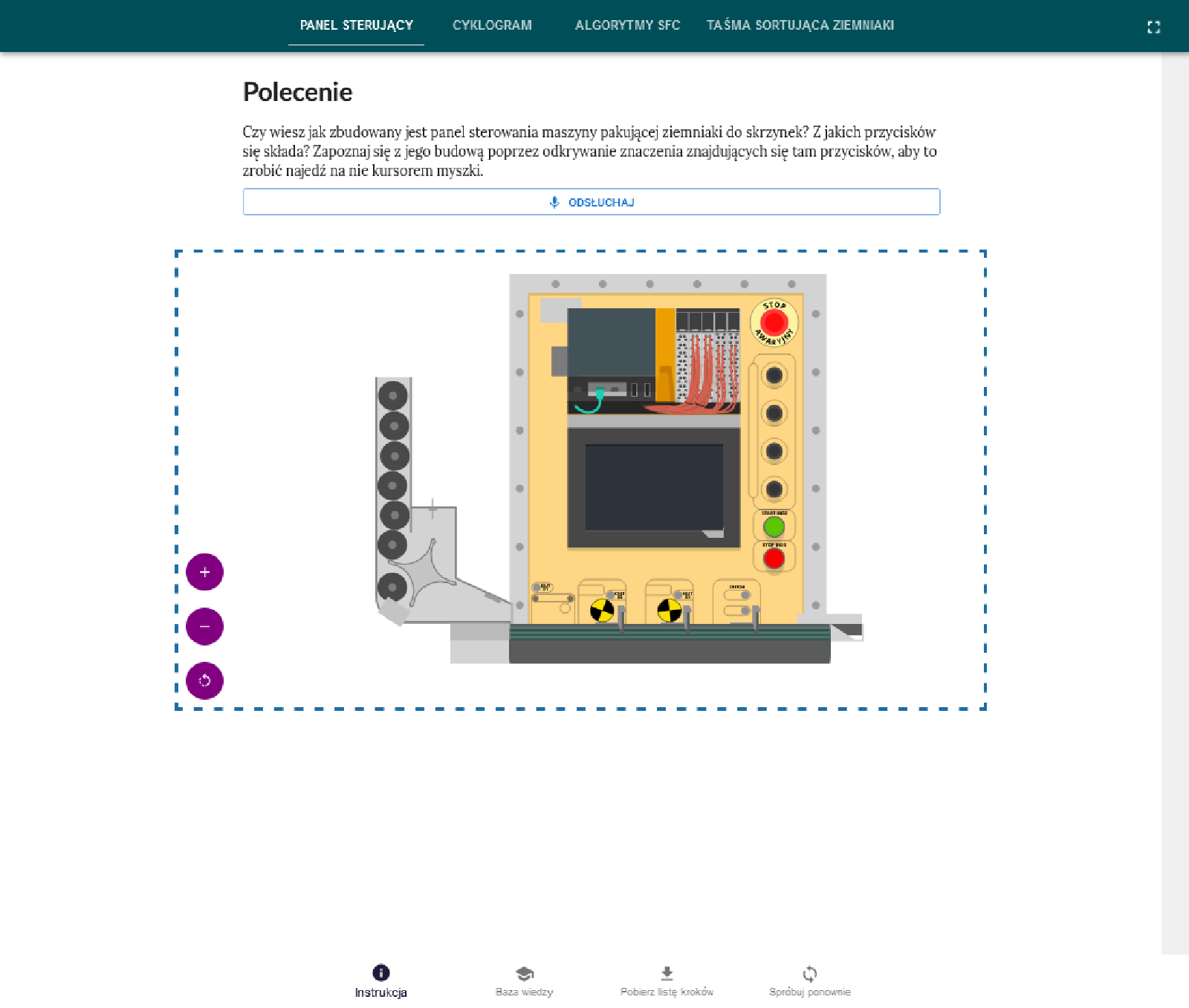 Elementy panelu sterowania maszyny pakującej ziemniaki do skrzynek przedstawione na modelu: