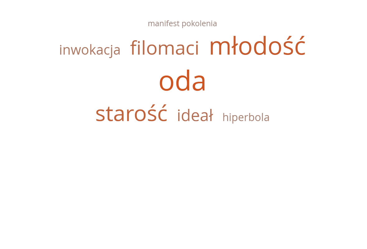 Słowa klucze: oda, młodość, starość, filomaci, ideał, inwokacja, hiperbola, manifest pokolenia.