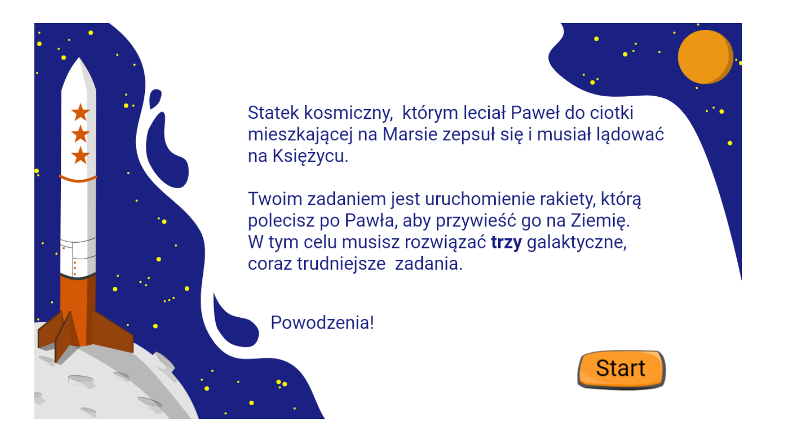 Statek kosmiczny, którym leciał Paweł do ciotki mieszkającej na Marsie zepsuł się i musiał lądować na Księżycu. Rozwiąż wszystkie zadania zapisane w Galaktycznej grze, a wystartuje rakieta, która zabierze Pawła z powrotem na Ziemię.