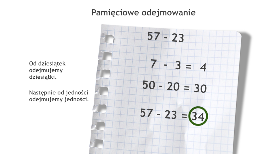 Trudniej jest obliczyć w pamięci taką różnicę, w której cyfra jedności odjemnika jest większa od cyfry jedności odjemnej. Zobacz, jakimi metodami można wykonywać takie odejmowanie.