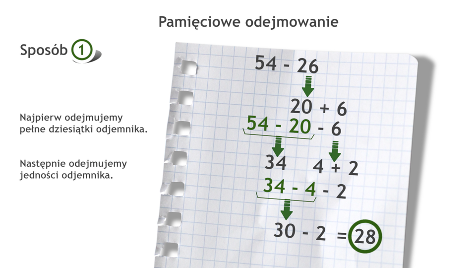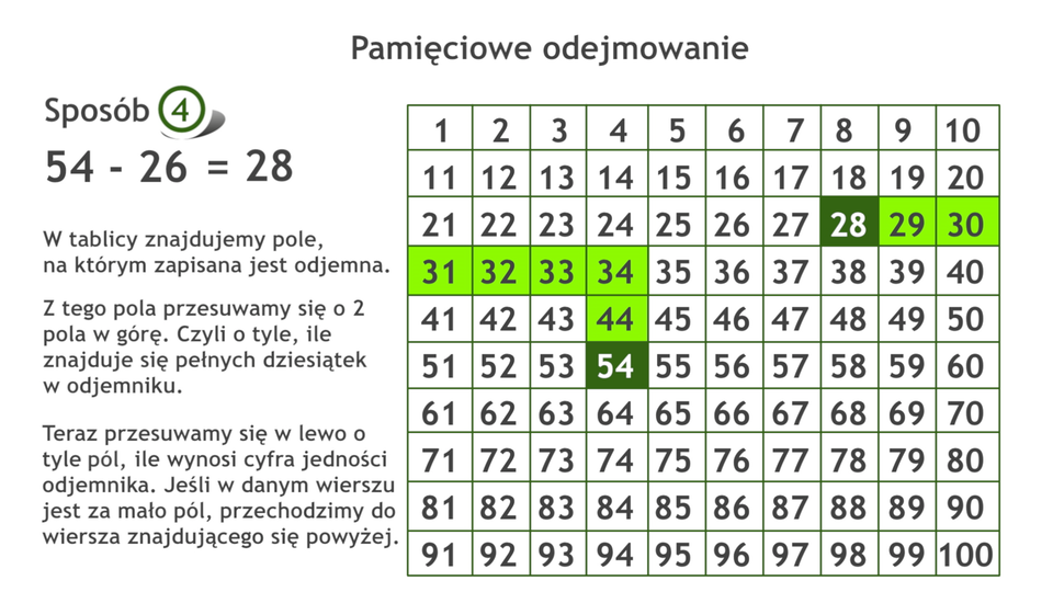 Animacja przedstawia pierwszy sposób pamięciowego odejmowania liczb.