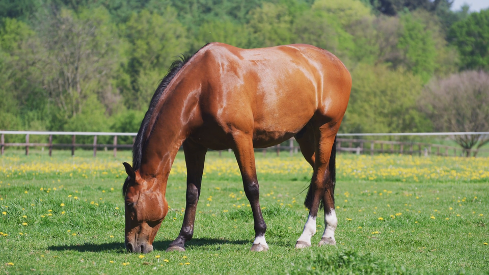 Na grafice nogi konia zaznaczona została tylna część kopyta. Szara plamka znajduje się również nieco nad kopytem, ale nie dosięga jego przedniej części.