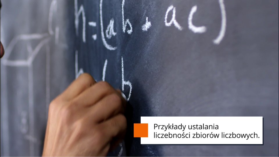 Lektor czyta: Zapoznaj się z przykładami ustalania liczebności zbiorów liczbowych. Na slajdzie pojawia się kadr w którym uczeń pisze wzory matematyczne na tablicy.