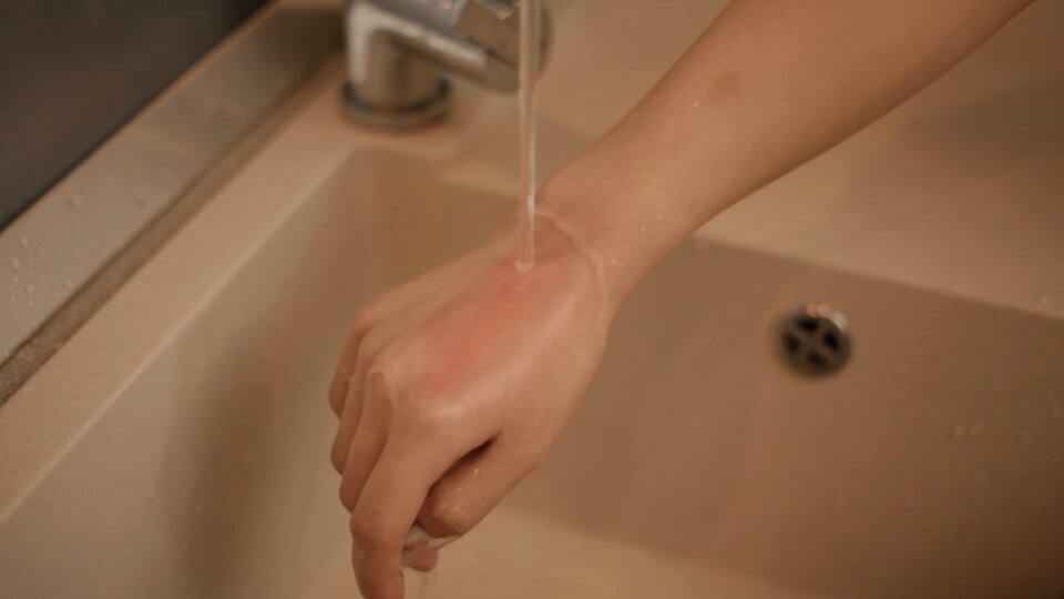 Film przedstawia prawidłowy sposób udzielenia pierwszej pomocy w przypadku oparzenia termicznego.