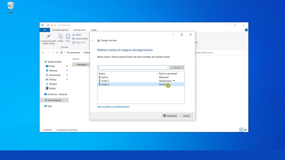 Gdy na liście pojawi się nazwa Wszyscy lub nazwa użytkownika, po prawej stronie wybieramy poziom uprawnień. Jeśli chcemy tylko udostępnić możliwość pobierania danych, należy wybrać Odczyt, jeśli chcemy również udostępnić możliwość zapisywania plików, wybieramy opcję Odczyt/zapis. Następnie klikamy Udostępnij na dole okna.