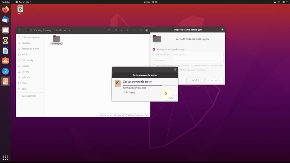 Aby udostępniać zasoby w systemie Ubuntu, należy zainstalować usługę udostępniania. Możemy to zrobić przy pierwszej próbie udostępnienia. System poinformuje nas o braku usługi i zaproponuje zainstalowanie. Aby udostępnić katalog, należy kliknąć na nim prawym przyciskiem myszy i z menu kontekstowego wybrać Współdzielenie sieci lokalnej.