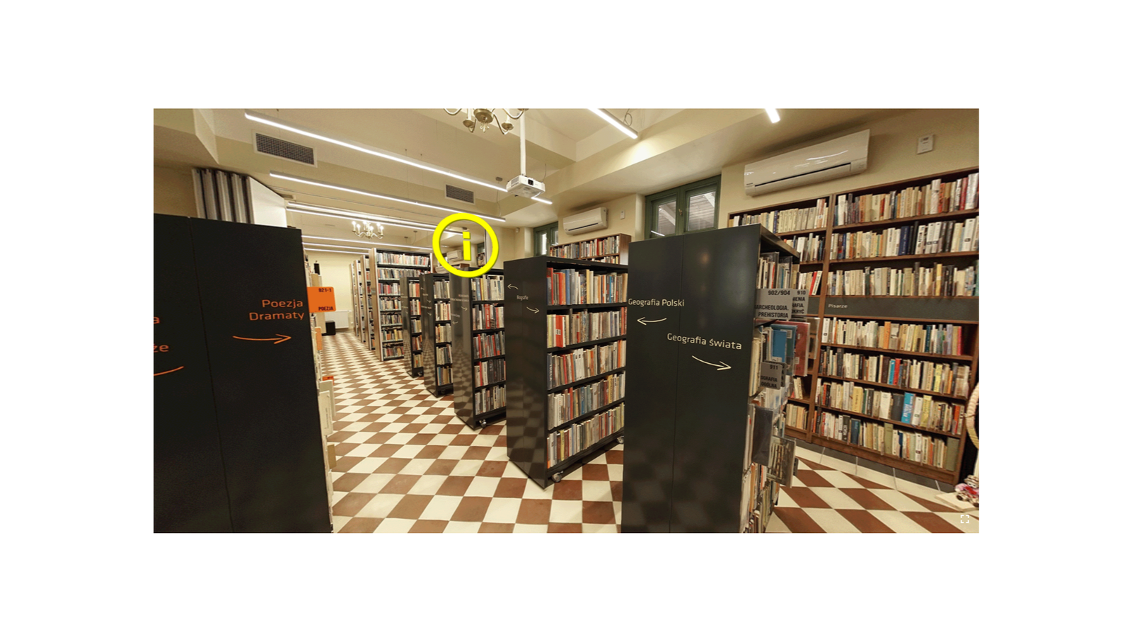 Książki układane są na wysokich regałach. W starszych bibliotekach regały mogą być ustawione tak blisko siebie, że uniemożliwia to korzystanie z zasobów osobom mającym trudności w poruszaniu się. Duża liczba regałów może powodować uczucie dezorientacji u osób starszych lub chorych, a także uczucie klaustrofobii. sala multimedialna