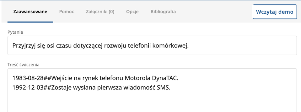 Aby oś czasu była edytowalna przez czytelnika, na końcu należy dopisać linijkę:{edytowalny}