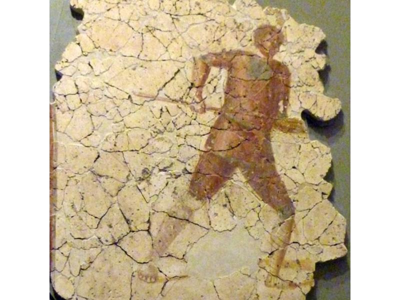 Ilustracja przedstawia fresk „Kosz z owocami" z Pompejów. Na kamiennym stole znajdują się naczynia z owocami. Pierwsze naczynie to duża przezroczysta misa, która wypełniona jest owocami granatu i winogron. Obok widoczny jest nadgryziony owoc. Z prawej strony znajdują się kolejne dwa naczynia: pierwszy - podłużny, garnek z nakryciem, a przed nim lezący żółtawy owoc. Obok kolejny gliniany garnek wypełniony owocami i opartą o niego pokrywą. Fresk ma prostokątną, brązową ramę. Na fresku widoczne są pęknięcia oraz ubytki.
