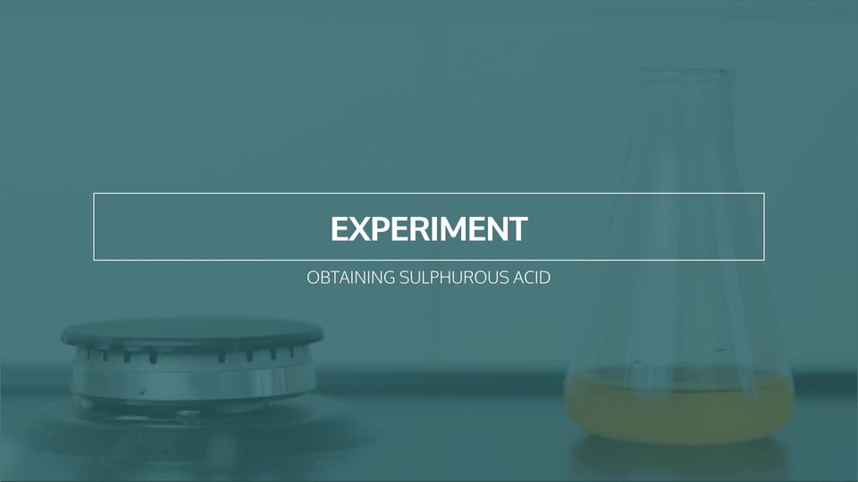 Eksperyment otrzymywanie kwasu siarkowego cztery, Obtaining sulphurous acid. Do realizacji eksperymentu służą woda, oranż metylowy, siarka, metalowa łyżeczka, palnik. Siarka na metalowej łyżeczce podgrzewana jest i zapalana palnikiem, a następnie na łyżeczce wkładana do kolby z wodnym roztworem oranżu metylowego (pomarańczową substancją). Kolba zostaje zamknięta folią aluminiową. W wyniku spalania siarki wydziela się gaz, a substancja zawarta w kolbie staje się czerwona. Pojawia się w lewym górnym rogu napis ha dwa es o trzy.