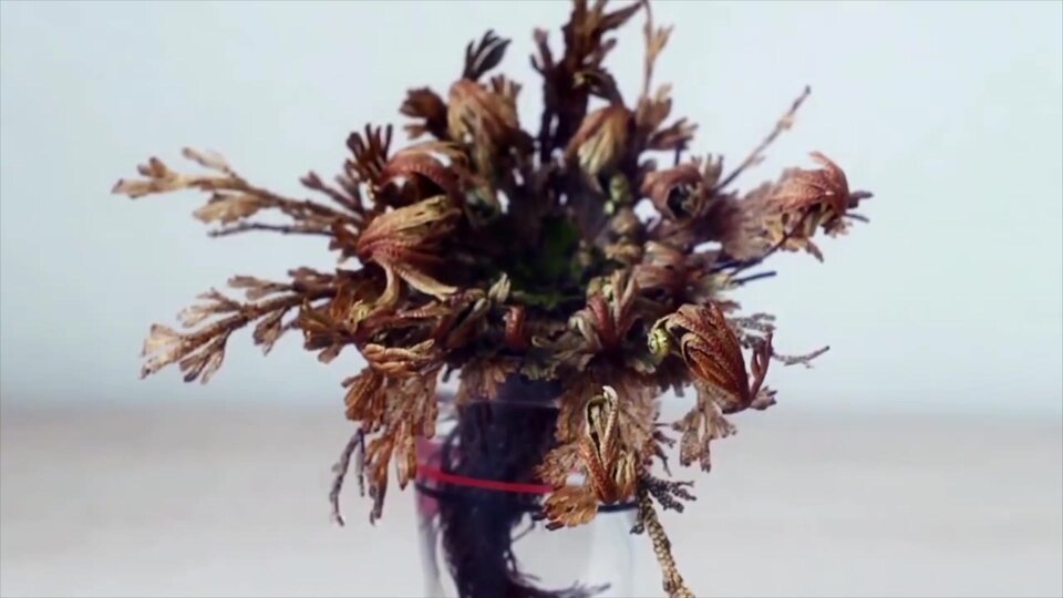 Film przedstawia w przyspieszonym tempie, jak po włożeniu widliczki do szklanki z wodą jej suche, brązowe, zwinięte liście rozwijają się i zielenieją.