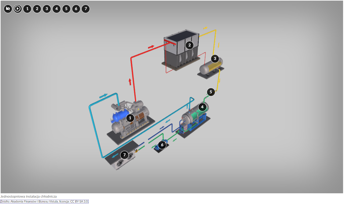 Widoczny jest ekran startowy wizualizacji – czarne pole z informacją: Kliknij, aby pokazać model. Po kliknięciu pojawia się szara plansza z pierwszym modelem. Model możemy dowolnie obracać, przybliżać, oddalać za pomocą myszki. Na poszczególnych częściach urządzenia widoczne są punktory. Punktory znajdują się również w lewym górnym rogu planszy. Oprócz numerów od 1 do 7, tożsamych z tymi na planszy, widoczne są dwie ikony – od lewej: okrągły przycisk z przekreślonym znakiem kamery: zresetuj kamerę, obok okrągły przycisk ze znaczkiem plej: zatrzymaj kamerę. Po kliknięciu poszczególnych punktorów z prawej strony ekranu rozwija się zakładka z nazwą urządzenia.