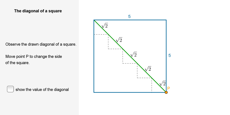 Geogebra aplet - przekątna kwadratu. Galeria z opisami alternatywnymi poniżej.